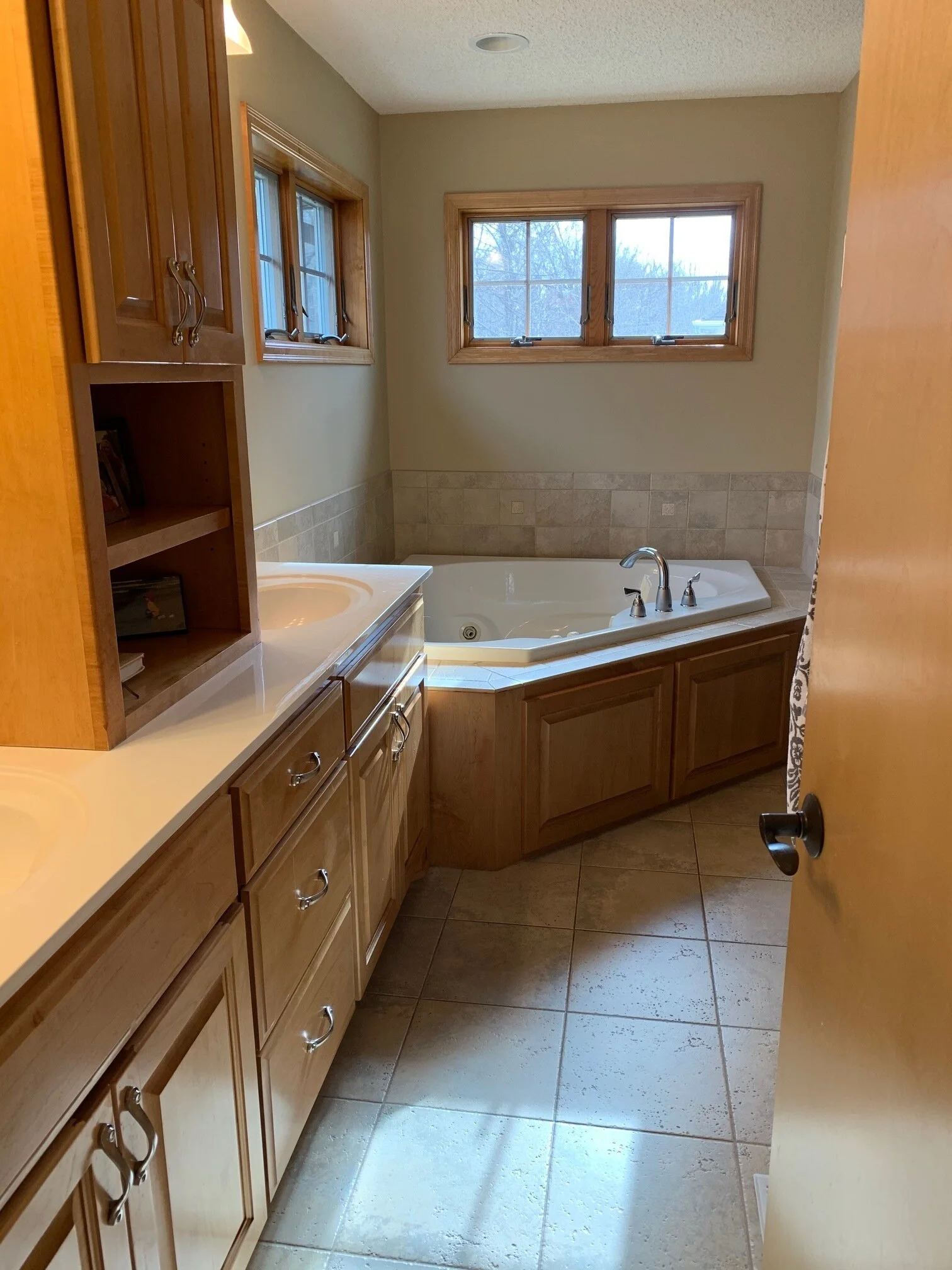 We have a long-standing relationship with Angie and John; they custom-designed & built their home with Mega Homes in 2005. This was the 2nd home they entrusted Mega to build for them. We also came back and finished their basement a few years later and did some painting updates for them a few years ago. When they originally moved in, their 2 kids were young but are now out of the home with their youngest finishing his last year of college. They still love their home and location in Dayton. Butting up to the Elm Creek Park Reserve they don’t see a move in their near future. This time they contacted us to update and rearrange their master bathroom!